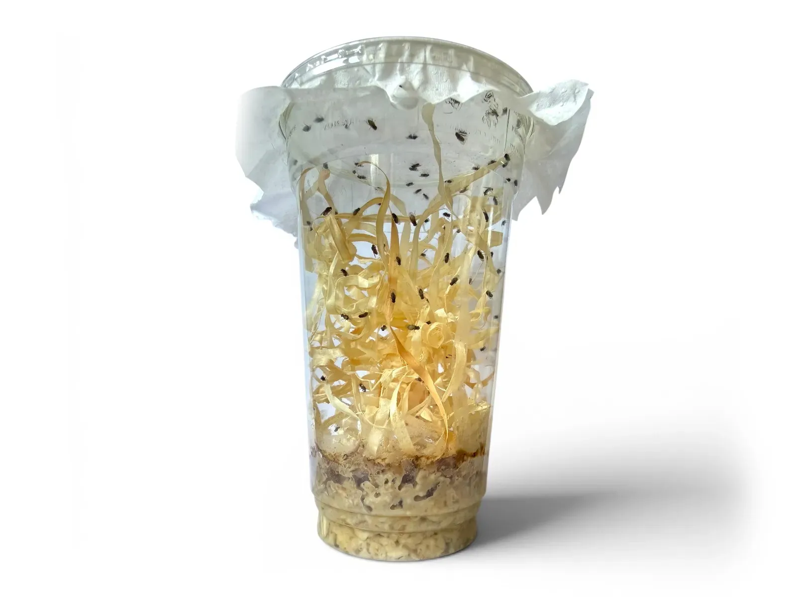 Gotowa hodowla muszek owocówek nielotów (Drosophila hydei) stanowi praktyczne i wydajne źródło pokarmu dla najmniejszych zwierząt egzotycznych. Dzięki naturalnie ograniczonej zdolności poruszania się wyłącznie po powierzchni, karmienie odbywa się w kontrolowany sposób.