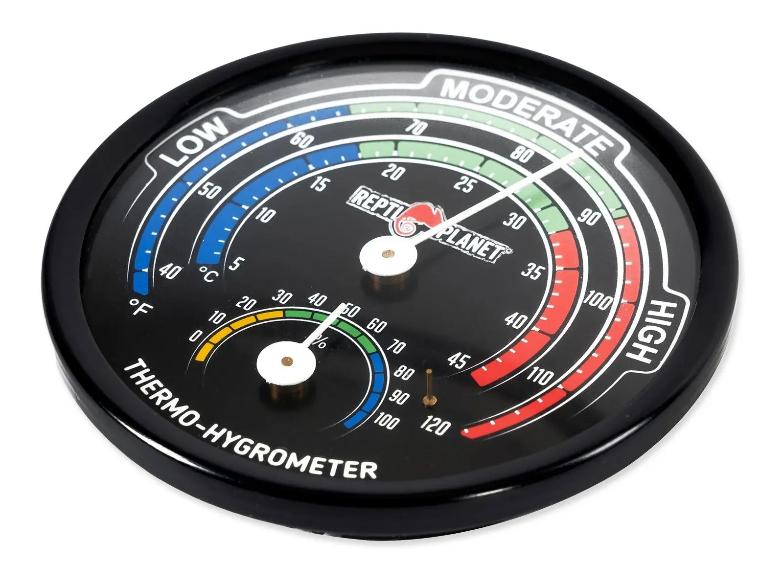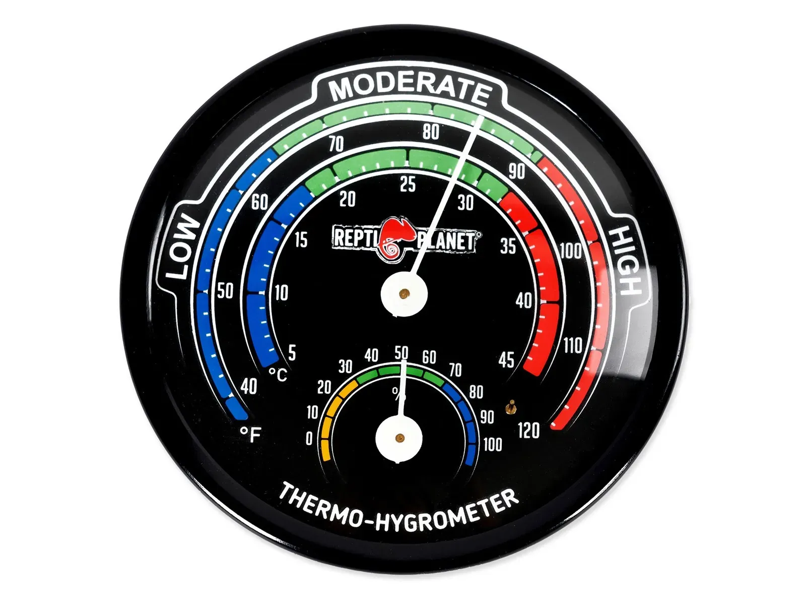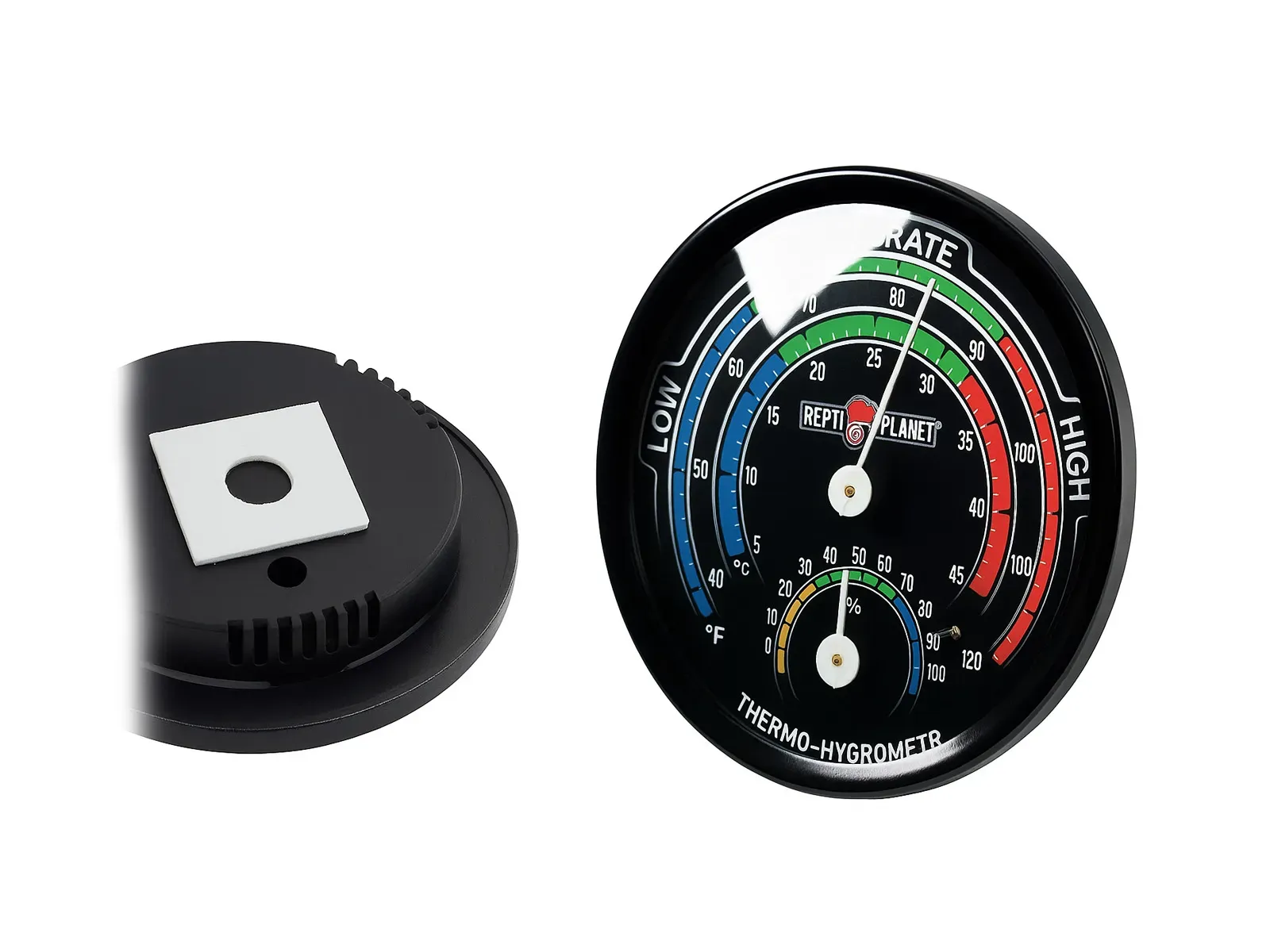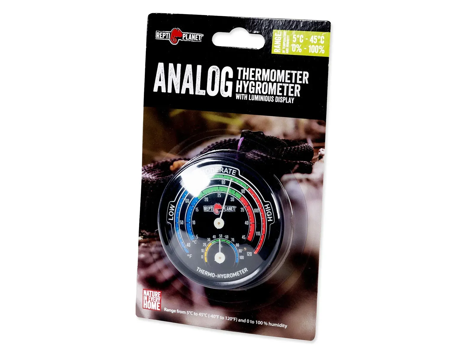Analogowy termometr z higrometrem Repti Planet umożliwia jednoczesne monitorowanie temperatury i wilgotności w terrarium. Luminescencyjna tarcza pozwala na łatwy odczyt także w nocy, bez konieczności używania dodatkowego oświetlenia. Urządzenie działa bez baterii i jest proste w montażu – wystarczy przykleić je na ściance terrarium.