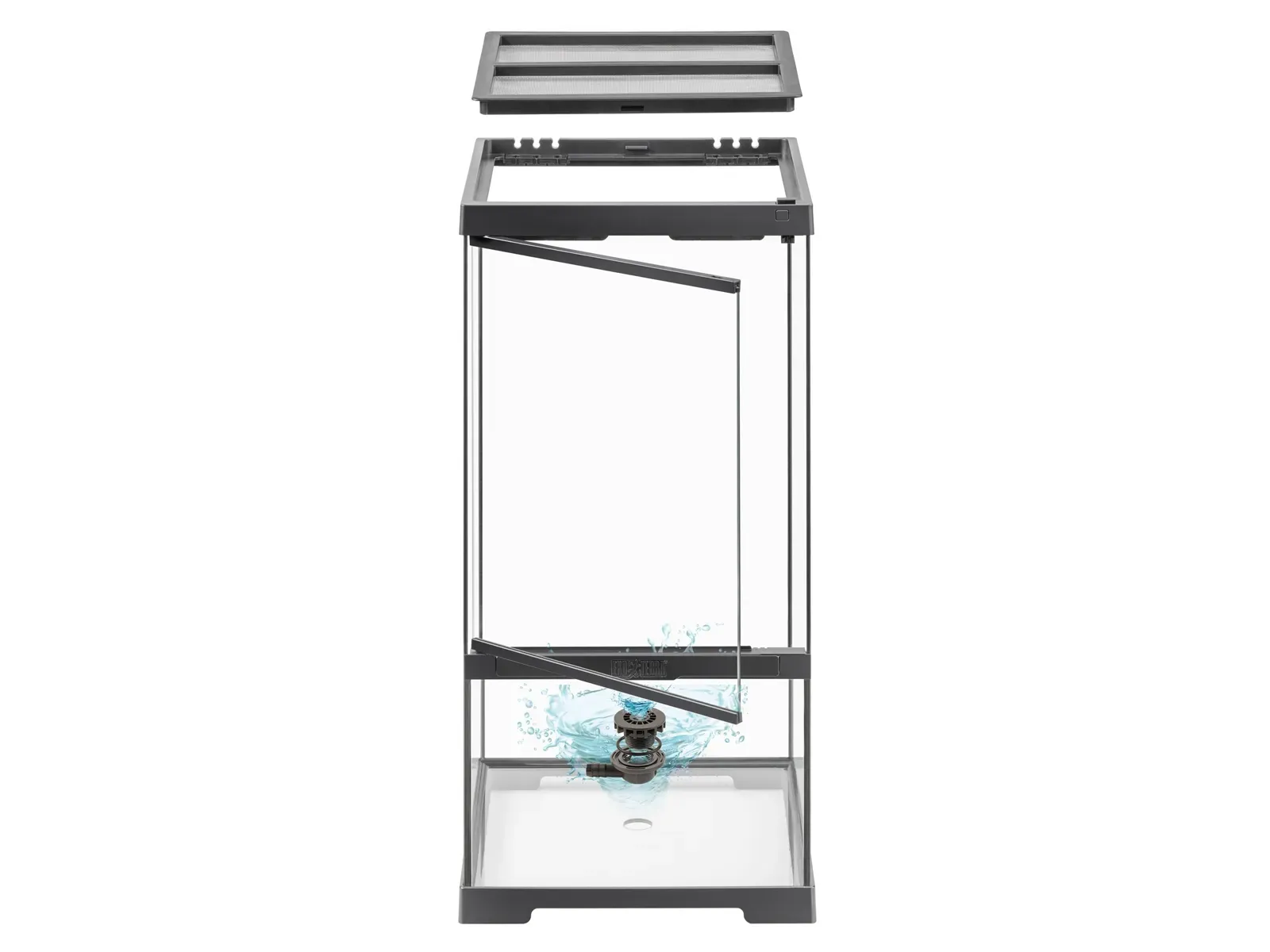 Terrarium wysokie 30x30x60 cm w wersji Pro XS umożliwia stworzenie zróżnicowanego środowiska wodno-lądowego w kompaktowym formacie. Konstrukcja pozwala wydzielić trzy strefy: lądową, przybrzeżną oraz wodną, dzięki czemu możliwe jest odwzorowanie naturalnych warunków dla małych płazów, gadów i bezkręgowców.