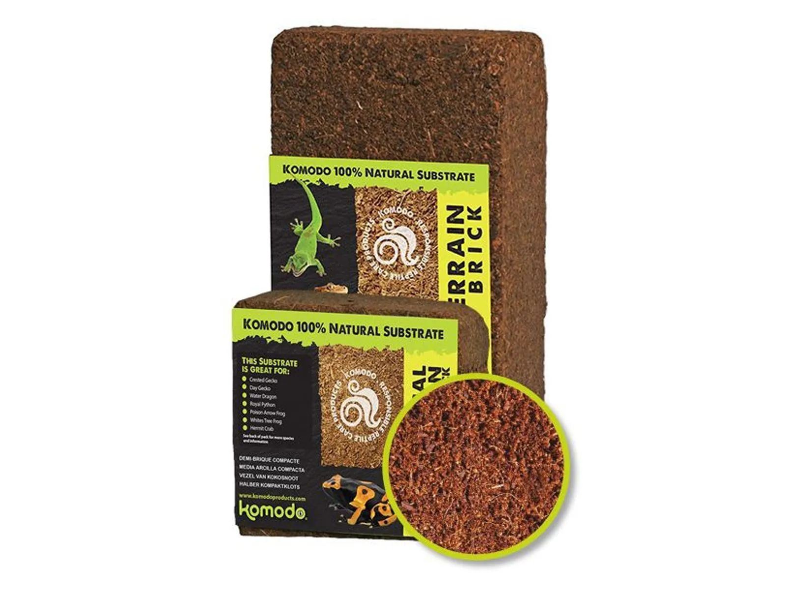 Komodo Brick S - Jest to mielone włókno kokosowe zaprasowane w kostkę. Podłoże to jest najczęściej używanym materiałem jako ściółka w terrariach dla ptaszników oraz innych zwierząt.